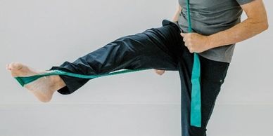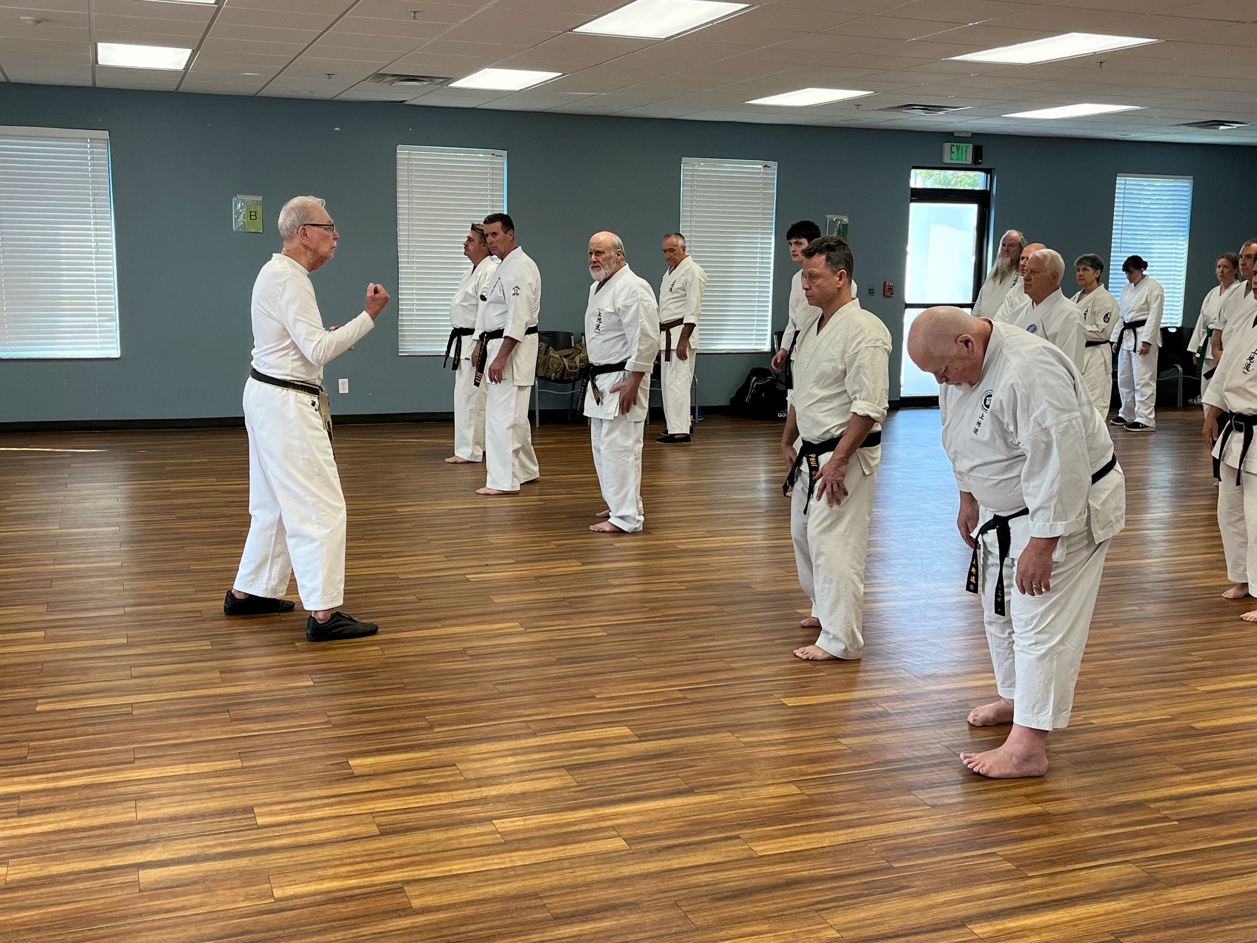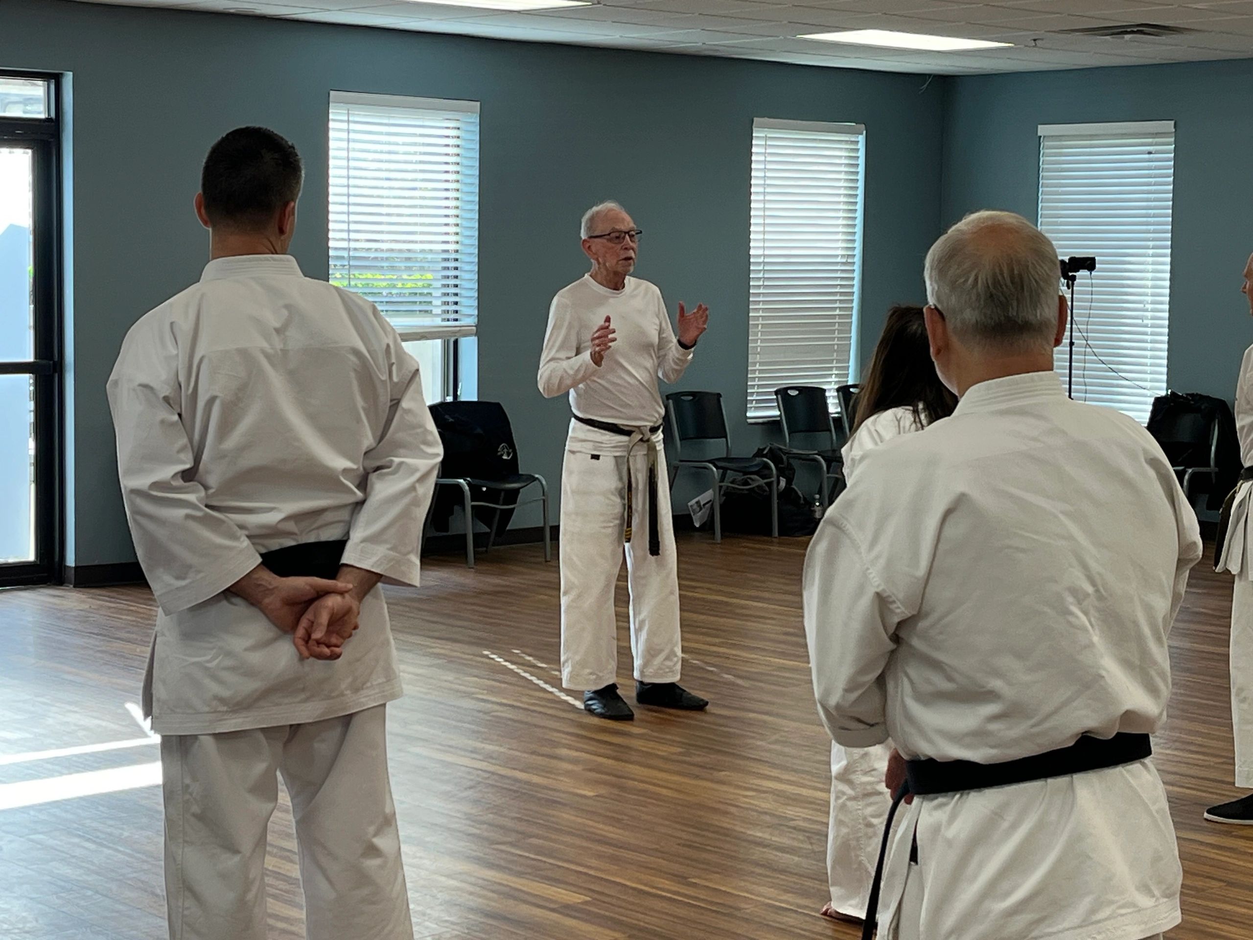 Sensei Testa leads the group in developing power from the floor using resistance bands.